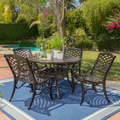 Each chair features a contoured shape design with curved armrests providing you and your loved ones with exceptional comfort the finishing touch: Good quality cast aluminium garden furniture.massive range. Wicker offers a warm look but requires more care than aluminum. Target / patio & garden / bronze patio side table. Metal dining sets come in a range of finishes to complement your outdoor decor.